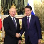 Conte kijelentette, hogy mielőbb véget kellene vetni az Oroszország ellen a Krími újraegyesülés és az Ukrajnában való „beavatkozása” miatt bevezetett uniós gazdasági szankcióknak. Kitért ugyanakkor annak a kérdésnek megválaszolása elől, hogy kormánya kész lenne-e megvétózni a büntetőintézkedések hatályának meghosszabbítását. Annyit mondott ezzel kapcsolatban, hogy Róma szeretné meggyőzni a többi európai kormányt arról, hogy előrelépés csakis a párbeszéden keresztül lehetséges.
