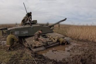 Az ukrán katonai személyzet egy brit bulvárlapnak tartott bemutatója során az Egyesült Királyság által adományozott Challenger 2 harckocsival…